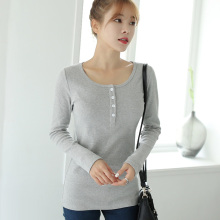 2016新款秋装韩版V领长袖T恤女 通勤修身纯棉螺纹长袖打底t恤衫
