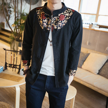 男士风衣男中长款复古中国风男装个性潮刺绣亚麻龙袍外套男款大衣