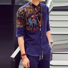 亚麻七分袖衬衫宽松刺绣中国风男装复古中袖棉麻短袖麻料男士衬衣
