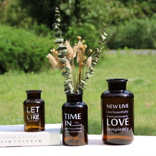 北欧式ins透明棕色英文字玻璃复古茶色插花干花花瓶摆件拍照道具