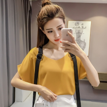 2017夏装新款韩版宽松显瘦V领短袖雪纺衫女露肩时尚百搭打底上衣