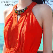 度假小姐波西米亚长裙女装沙滩裙橙色连衣裙女夏泰国海滩裙吊带裙