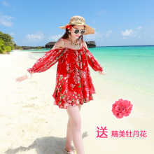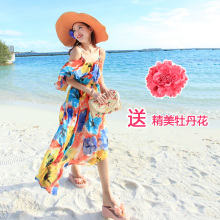 夏季连衣裙中长款娃娃衫短袖露肩雪纺印花仙女性感吊带短裙沙滩裙