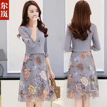 2017夏季新款韩版修身拼接假两件印花A字裙中长款短袖雪纺连衣裙