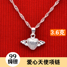 正品999纯银项链女款爱心天使吊坠短款锁骨链足银简约千足白银饰