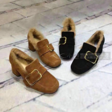 欧洲站2016冬季欧货羊猄皮真皮兔毛方头乐福鞋女中跟奶奶鞋潮XC49