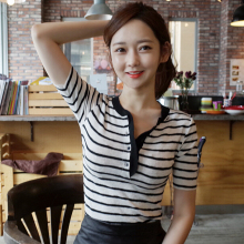 现货韩国东大门代购女装2017春装新款修身条纹半开领短袖T恤mp