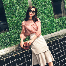2017夏装新款女装韩版宽松木耳边雪纺衫女七分袖纯色飘带t恤上衣