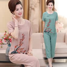 春夏季时尚妈妈装套装短袖t恤中老年棉麻七分裤上衣薄款清凉套装