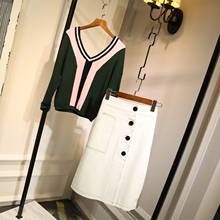 秋冬韩版套装2016新款 时尚气质V领长袖毛衣中长款牛仔裙两件套女