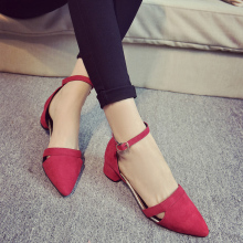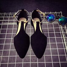 2017春夏平底单鞋尖头浅口绒面女鞋中空一字搭扣金属百搭罗马凉鞋
