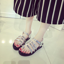 2016新款夏季欧美铆钉细带镂空厚底松糕鞋罗马女式套趾平底凉鞋潮