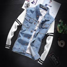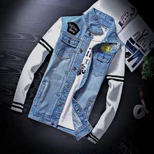 潮男修身牛仔外套青少年毛衣袖夹克针织拼接牛仔服学生牛仔褂男装