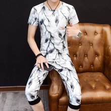 男士个性印花短袖t恤休闲套装男夏季韩版潮流两件套青年短裤一套