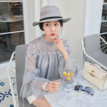 碎花雪纺衫喇叭袖上衣女性感透视网纱蕾丝打底衫女长袖2017新款