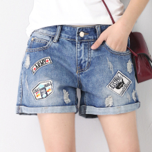 路口牛仔短裤女夏宽松破洞休闲学生热裤浅色卷边三分裤贴布牛仔裤