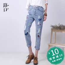 路口新款2016秋季个性磨破牛仔裤女士休闲哈伦裤潮高腰显瘦小脚裤