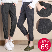 秋季女装新款毛呢女裤宽松显瘦哈伦裤英伦风条纹小脚裤大码长裤子