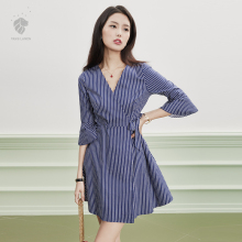 范思蓝恩高腰中袖条纹连衣裙女韩版修身荷叶边V领衬衫裙中长裙子