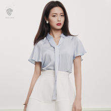 范思蓝恩蝴蝶结V领上衣女夏职业装宽松衬衣雪纺白衬衫女短袖韩范