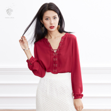 范思蓝恩V领雪纺衫长袖衬衫女百搭宽松绑带上衣韩版打底女士衬衣