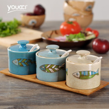 youcci悠瓷 手绘鱼纹陶瓷调味罐三件套带盖勺 家用调味盒厨房用具