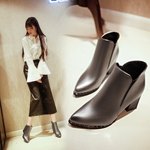 冬季欧美新款加绒靴子尖头英伦女鞋女士高跟马丁靴女套筒粗跟短靴