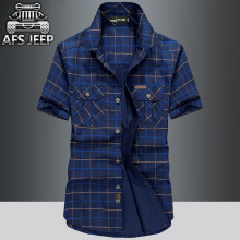 AFS JEEP夏季格子短袖衬衫男士纯棉休闲大码宽松薄款寸衫军装衬衣