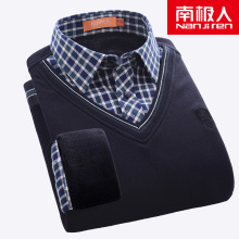 南极人冬季中老年加绒加厚假两件衬衫男保暖长袖针织衫毛衣男装