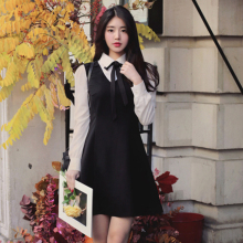 新款韩版淑女打底裙黑白拼接气质学院风长袖方领蝴蝶结修身连衣裙