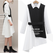 春夏欧美小方领白色长袖长款衬衫中长圆领背心修身两件套连衣裙