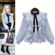 春夏新款欧美复古泡泡袖荷叶领蝴蝶结雪纺衫宽松长袖雪纺衬衫衬衣
