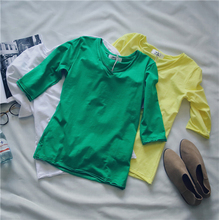 舒适竹节棉修身卷边V领七分袖女t恤学生韩版显瘦女士秋装打底衫