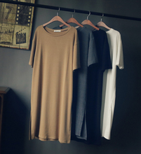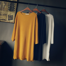 韩国宽松慵懒开叉坑条针织衫女长袖2017新款春中长款打底裙T恤衫