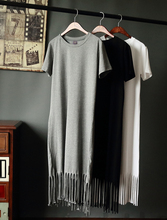 韩版宽松短袖长款T恤女夏季大码棉质流苏裙流苏连衣裙夏 懒人OP