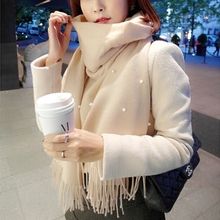 2016韩版手工钉珠珍珠围巾女秋冬季学生加长款加厚保暖两用大披肩