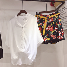 大码女装胖MM2017夏装新款两件套雪纺衫花短裤胖妹妹宽松显瘦套装