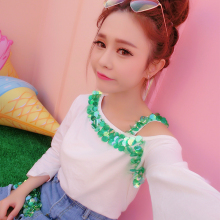 泰国潮牌夏季亮片钉珠七分袖露肩白色t恤女一字肩甜美韩版上衣