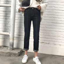 黑色牛仔裤女九分裤直筒宽松显瘦拼接女裤子明线毛边韩版女装春装