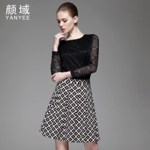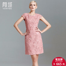 颜域2017夏新款欧美时尚优雅绣花蕾丝连衣裙中裙修身礼服收腰裙