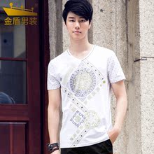 金盾男装2017夏季短袖t恤几何形印花休闲v领纯棉薄款时尚T恤衫潮