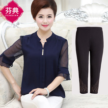 妈妈装夏装雪纺衫中老年女装气质上衣40-50岁夏季中长款两件套装