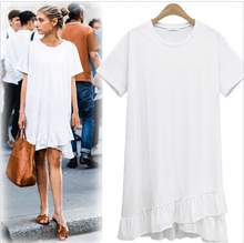 【小夏天】定制纯棉圆领纯色短袖下摆荷叶边直筒连衣裙T恤裙女夏