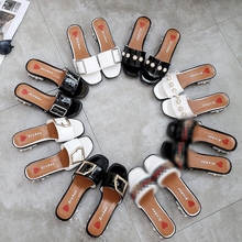 2017夏季甜美简约外穿潮拖鞋百搭平底一字拖金属扣凉拖鞋沙滩鞋女