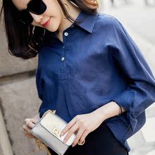 2017春装新款棉麻衬衫女装蝙蝠袖七分袖宽松大码短款休闲百搭衬衣