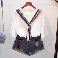 夏季新款韩版宽松甜美V领短袖雪纺荷叶边袖寄绳条纹打底衫上衣女