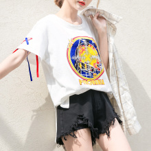 2017春夏季女学生新款复古绣玫瑰花朵宽松打底衫圆领短袖t恤上衣