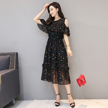 2017夏大码女装新款胖mm200斤中长裙 漏肩短袖复古碎花雪纺连衣裙