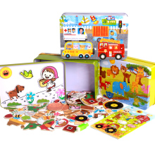 四合一木质拼图铁盒装儿童益智力卡通积木玩具4-5-6-7-8岁包邮热