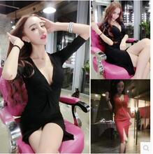 2017春季时尚女装性感交叉夜店深V领低胸包臀针织长袖显瘦连衣裙